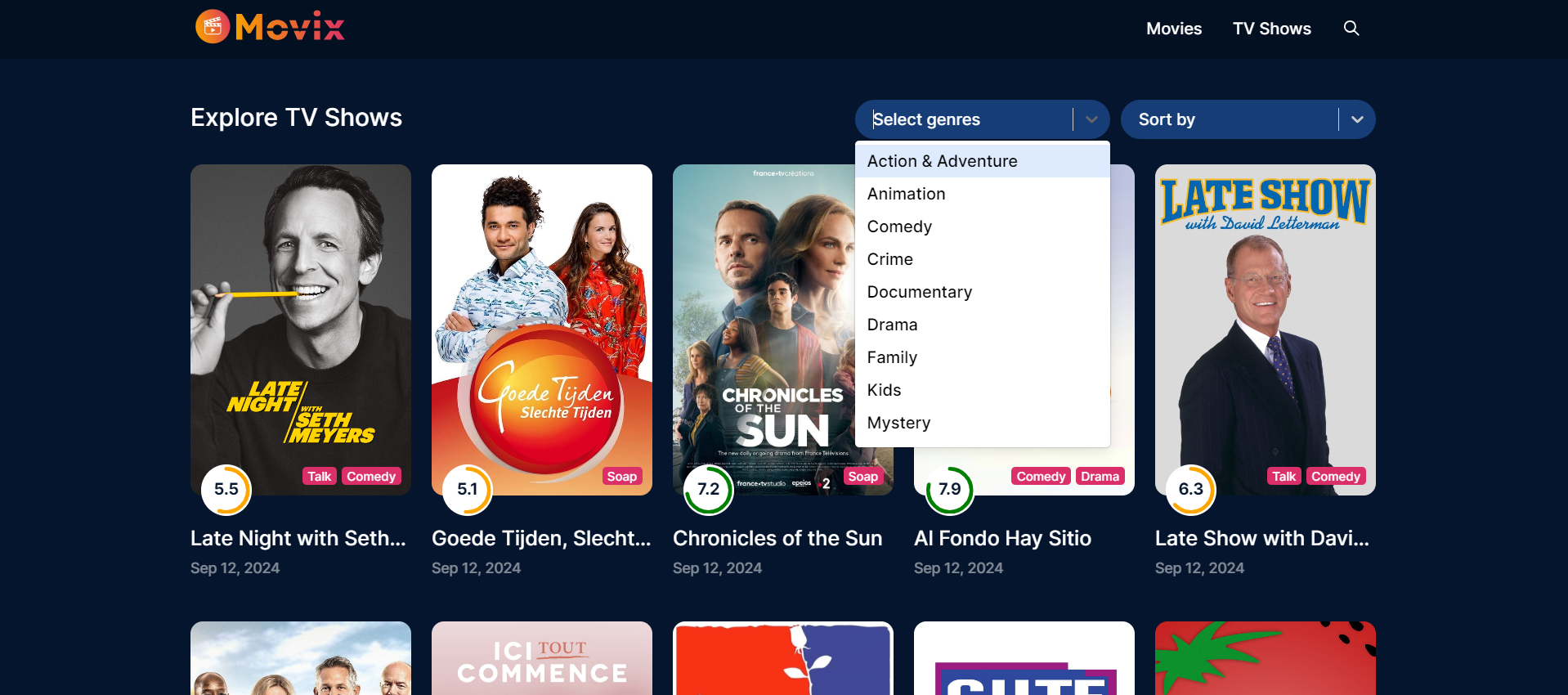 Movix is a React app for discovering movies and TV shows, offering detailed info for 1,000+ titles. Features detailed information for each title, including trailers and related videos, for over 500 releases.